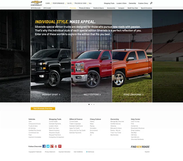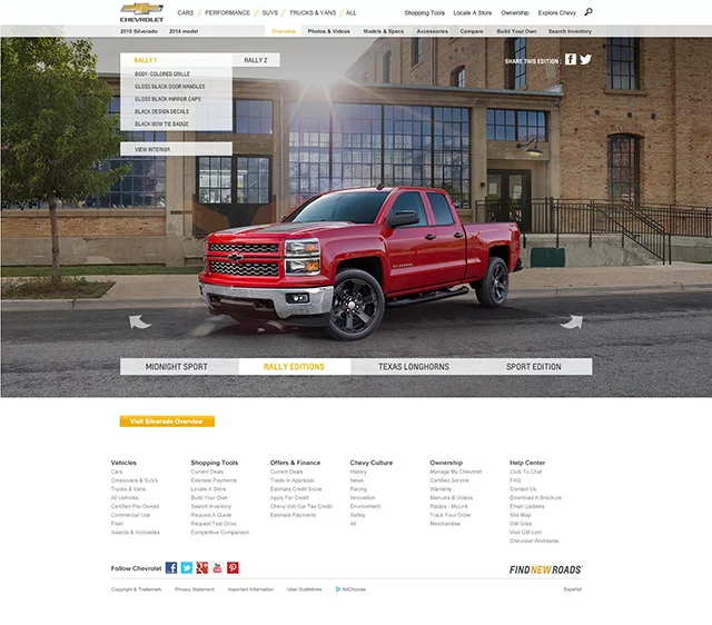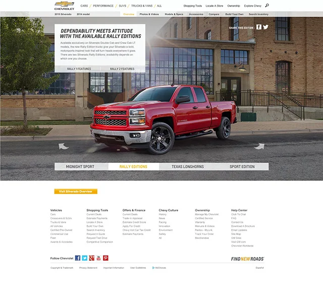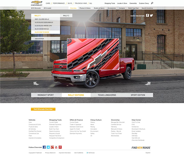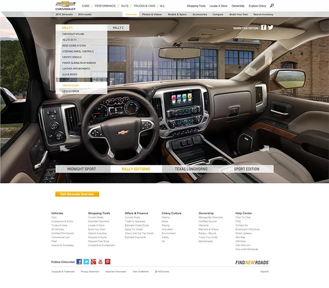 Concept for the Chevy Silverado Special Editions page. This concept allows users to get a true in depth look into each Special Edition and the type of person they are designed for. Users can select the vehicle that they want to learn more about from a carousel on the main page, from there they are able to get a brief overview of the vehicle and can click on specific vehicle features to learn more. One other feature is a 360 degree user controlled experience of each truck along with interior views.